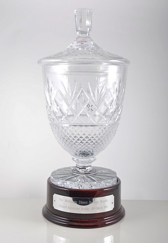 A Bohemian lead crystal covered vase, a racing trophy on a plinth, 46cm, boxed