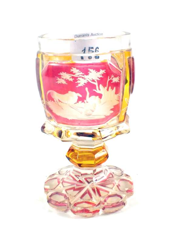 A Bohemian pink and amber flashed vase with engraving of a hunting scene