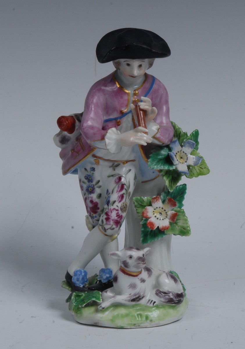 A Bow figure, of a huntsman, standing, a dog at his feet, wearing a broad brimmed hat, wearing a lilac jacket and floral trousers, a bag over his shoulders
