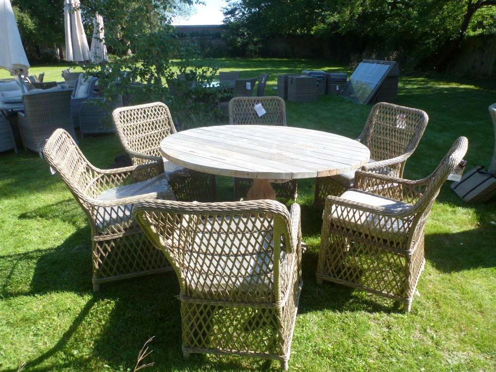 A Bramblecrest Kuta 145cm round table with six armchairs