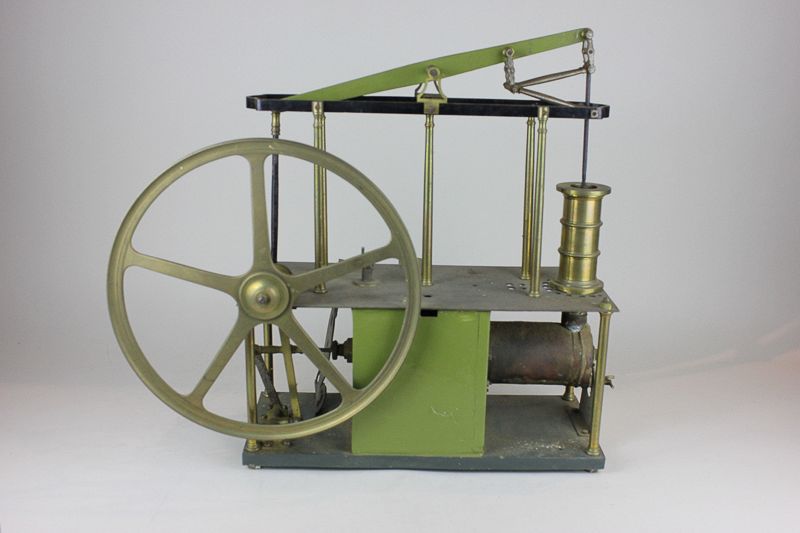 A brass scratch built table top model of a steam engine, with beam and wheel