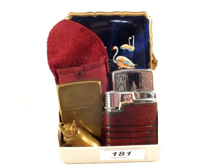 two Ronson and two Zippo lighters plus a cigarette case with Flamingo decoration to front