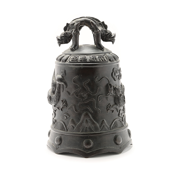 The bell cast with a twin dragon loop handle, the exterior decorated with opposing dragon and phoenix centering a flaming pearl above waves, with a horizontal four character mark reading 'Yongcun Zhenwan' above the central decoration. Late Qing Dynas