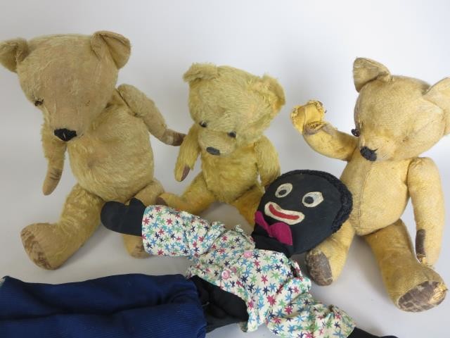 A large 1940's Golliwog with appliqu features, a 1940's fully jointed musical Teddy Bear and two other bears. Largest 23in H