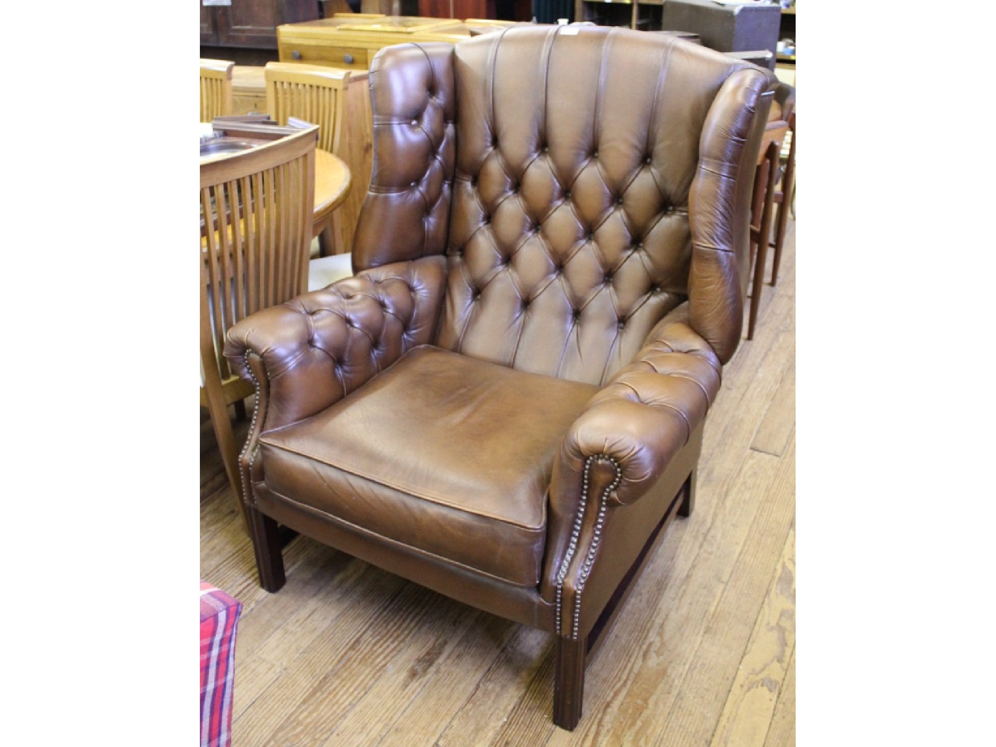 A brown leather wing armchair, of broad dimensions, with moulded square section legs and stretcher