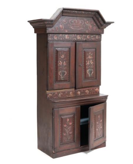 A brownpainted cupboard, richly decorated with flowers