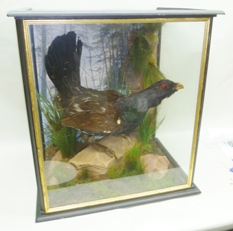 A CAPERCAILLIE modelled on a rock in naturalistic setting with landscape painted background, in painted glazed display case, 76cm high x 70cm wide