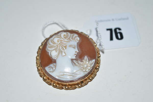 A carved shell cameo brooch, in 9ct. yellow gold twisted mount.