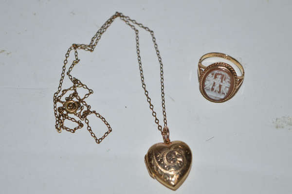 A carved shell cameo ring depicting the Three Graces, in 9ct. yellow gold shank, ring size N; together with a heart-shaped locket pendant, 9ct. yellow gold, engraved with feather scrolls, on chain.