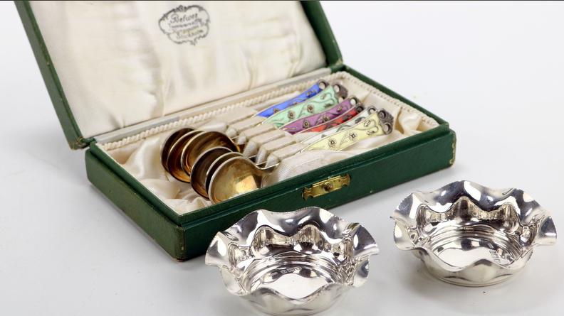 The gilded spoon with enamel in various colors on the stem with floral decor. Sweden, after 1988. The scalloped bowls around. England, London. S. Mordan & Co. Jl. 1903-1904. Z. 925. Hover to zoom