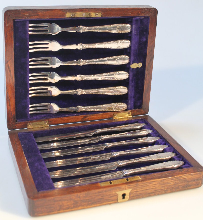 each with shaped handles and plain blades in an oak case with a vacant shield cartouche, 6cm high, 23cm wide, 18cm deep.