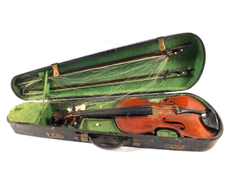 A cased violin and two bows