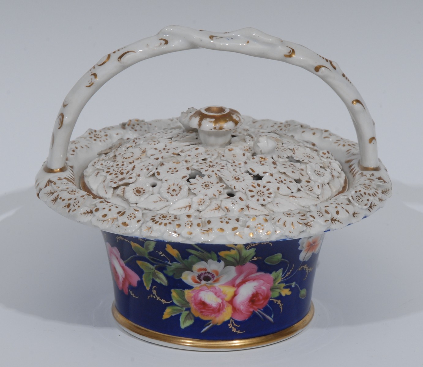 decorated with peonies and other flowers, in colours on a blue ground, the cover and everted rime ... encrusted overall with flowerheads and foliage, picked out in gilt, rustic handle