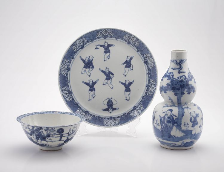 painted with a sage seated beneath a tree attended by two young boys, one holding a lotus bloom and pointing to two flower-filled vases beneath a stylised moon and clouds, the reverse with a butterfly and bird, 22,5cm high; a Chinese blue and white p