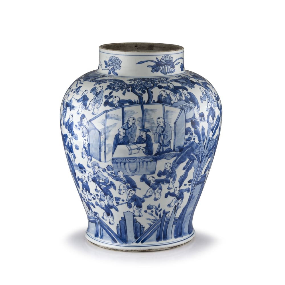 the baluster body profusely decorated with young boys at play and attending scholarly pursuits before rocky outcrops, plantation foliage and balustraded gardens, the neck with sprays of peonies between blue-line borders, underglaze-blue double ring m