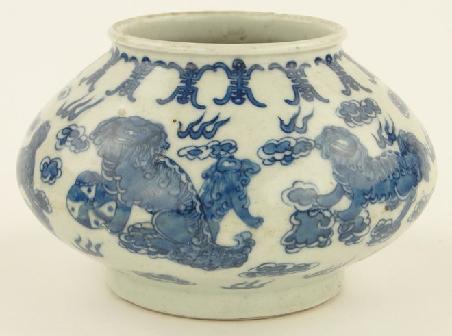 A Chinese blue and white wash pot, with iron dog decoration, diameter 6''.