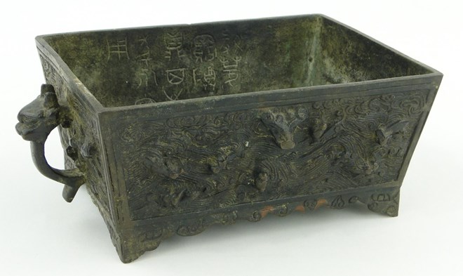A Chinese bronze jardiniere of rectangular form, with relief cast wave design surround, and dragon design handles, text inscription to the interior, length excluding handles 7''.