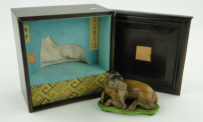 A Chinese carved jade ornamental reclining deer, length 3.5'', on green stained ivory stand, in original panelled stained wood box with printed labels.