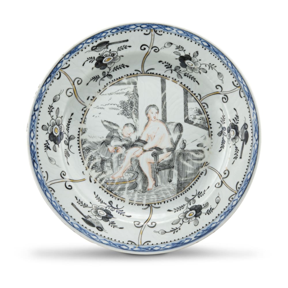 the centre decorated with a maiden preparing to bath, an attendant pouring water into a basin, enclosed by a black-and-gilt line work, the border with six alternating panels enclosing a flowerhead, a further flowerhead and bird, further enclosed by a