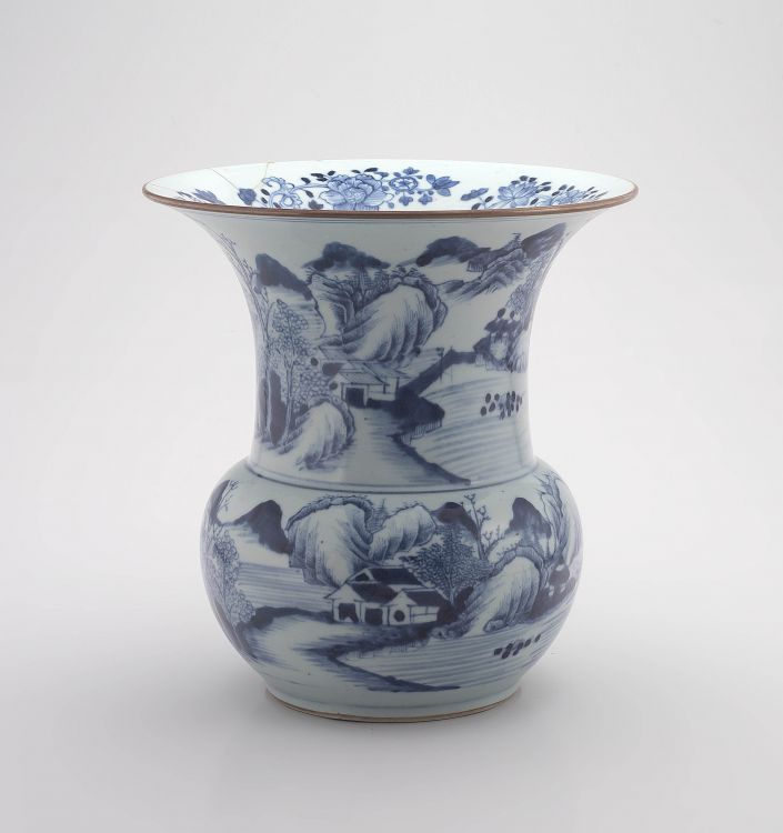 of baluster outline, the reverse decorated with figures and dwellings in a mountainous landscape, the flared mouth decorated with sprays of peonies, sienna-glazed rim, chip, cracks, 27cm high