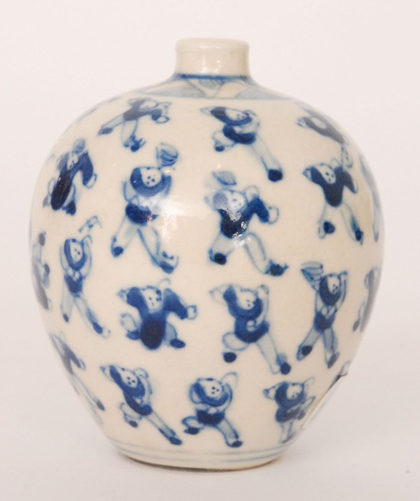 A Chinese export vase of ovoid form decorated with blue and white dancing figures in various poses, bears six character mark, height 7.5cm