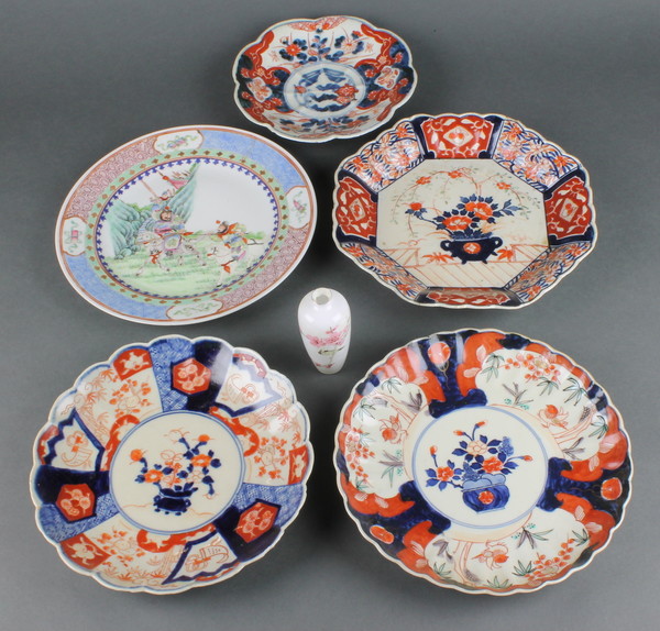 a white glazed oviform vase decorated a bird amongst flowers 3" and 4 Imari plates