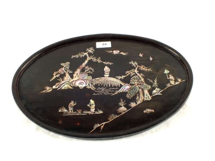 A Chinese oval tray with Mother of Pearl figure and landscape decoration