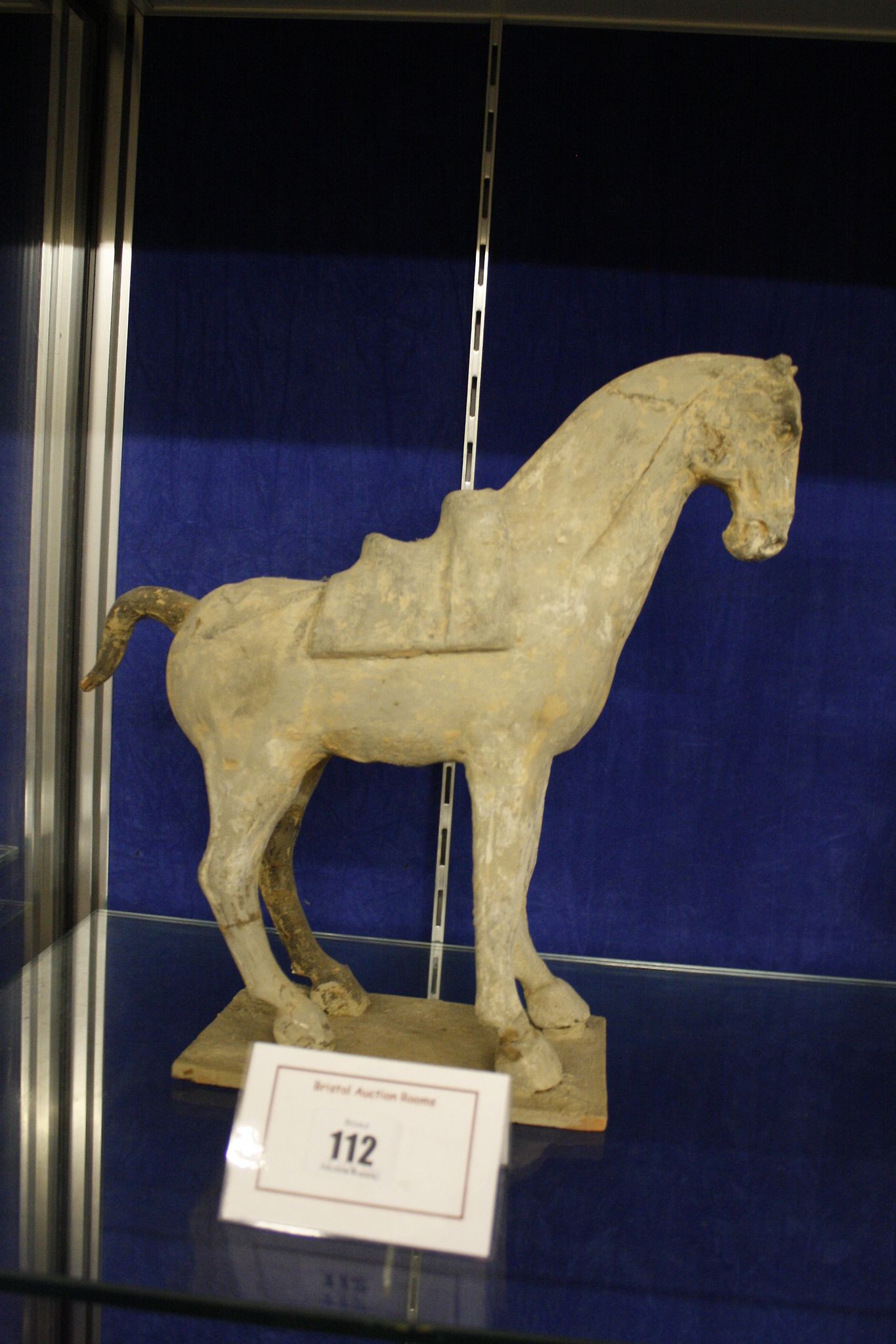 A Chinese pottery model of a saddled standing horse , possibly Tang dynasty, 32cm high