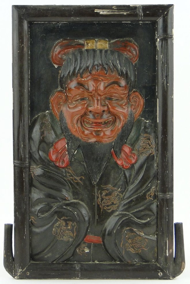 A Chinese relief carved and lacquered wood panel, depicting a bearded man, 19/20th century, in simulated bamboo frame, height 20''.