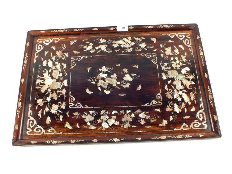 A Chinese Rosewood rectangular tea tray with extensive Mother of Pearl floral inlays