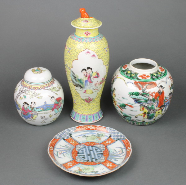 a ginger jar with lid, a ditto without lid and an Imari plate