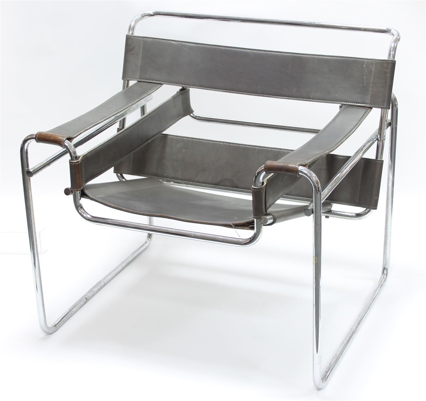 the bent tubular steel frame supporting grey leather straps forming the seat, back rests and arm rests, unmarked