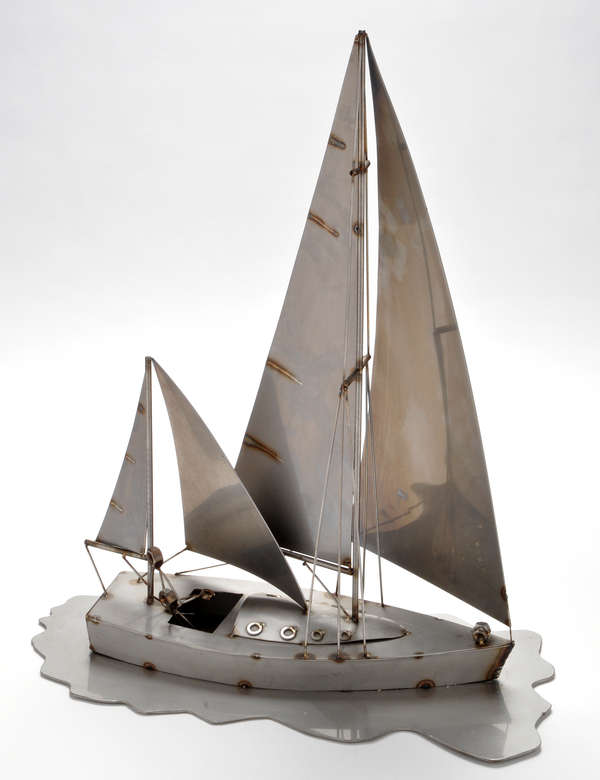A chromed metal model of a sailing ship at sea, the man steering made from bolts, on shaped base