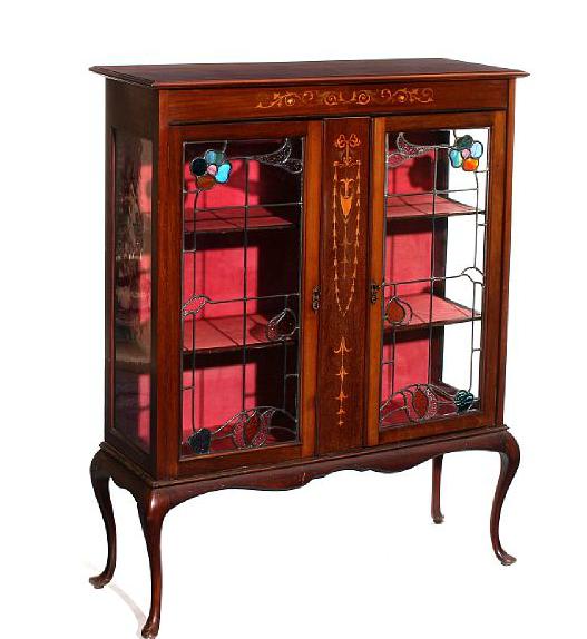 A circa 1900 English mahogany display cabinet, inlaid with foliage and vases, front with two stained glass doors