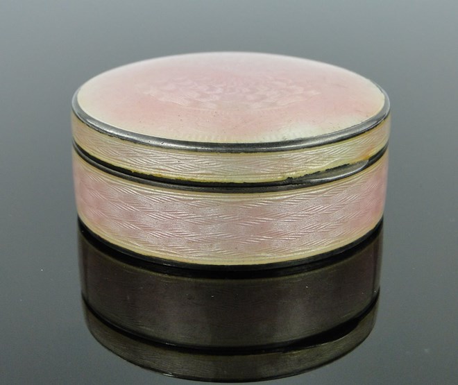 A circular silver and pink enamel box, with hinged lid, import marks Birmingham 1942, 6cm across.