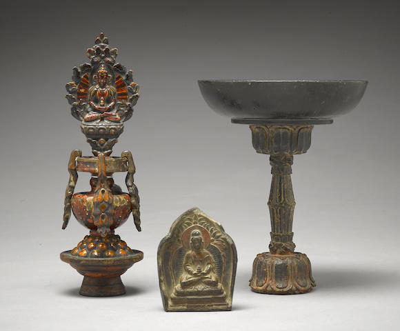 The first, 18th century, molded with Amitayus (chipped); the second, a 19th-century lacquered wood offering with Amitayus rising from a kalasa (wear); the third, a 19th century wood stem cup (wear).