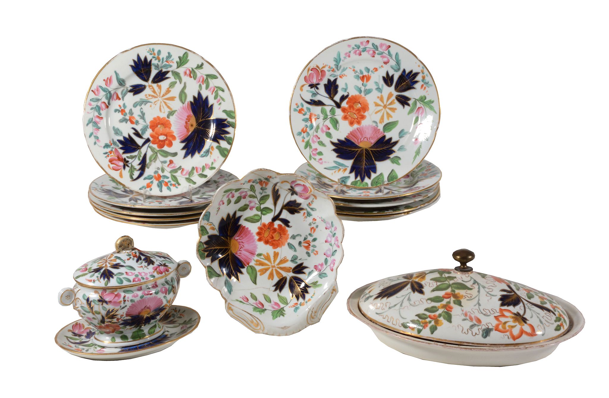 comprising: an oval tureen and cover; a sauce tureen cover and stand; a shell dish and ten plates Poor quality throughout