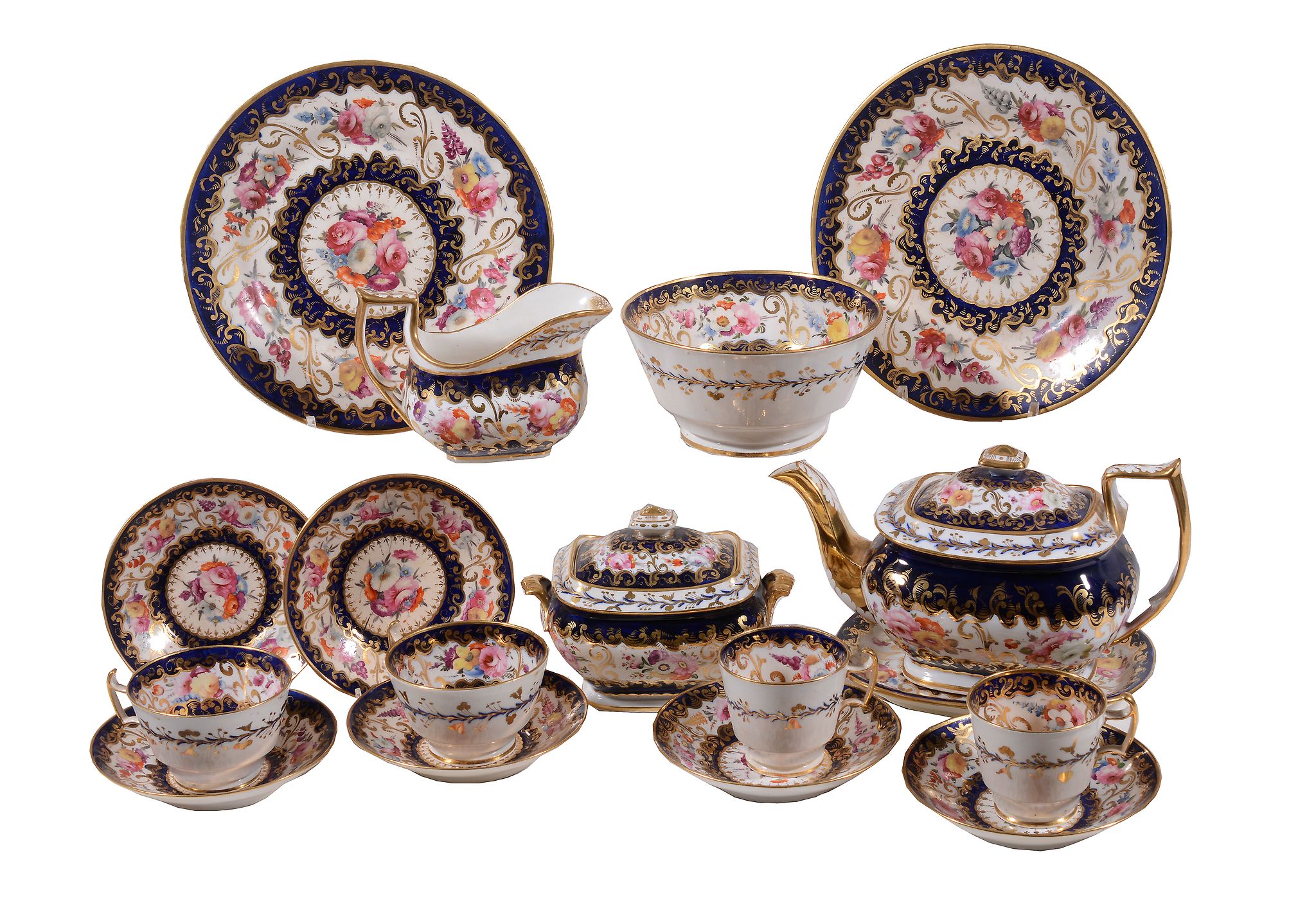painted with flowers within blue and gilt bands, comprising: a teapot, cover and stand; a pair of sandwich plates; a slop bowl; a sugar box and cover, a milk jug; eleven coffee cups; ten teacups and eight saucers, painted pattern no. 730