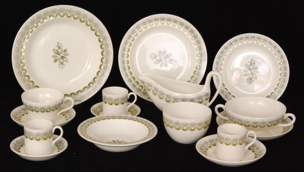 A collection of assorted Eric Ravilious for Wedgwood Yellow Persephone / Harvest Time dinner and teawares comprising four coffee cans, three saucers, three teacups and saucers, three cereal bowls, a shallow plate, a 33cm long meat plate, two shallow