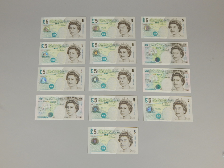 A collection of fifteen £5 notes, chief cashier Martyn Louther, to include a consecutive run of four