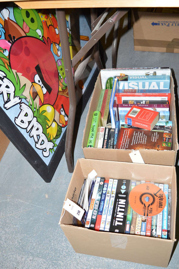 A collection of modern books; DVD's; etc., in two boxes; and a framed poster titled 'Angry Birds'.