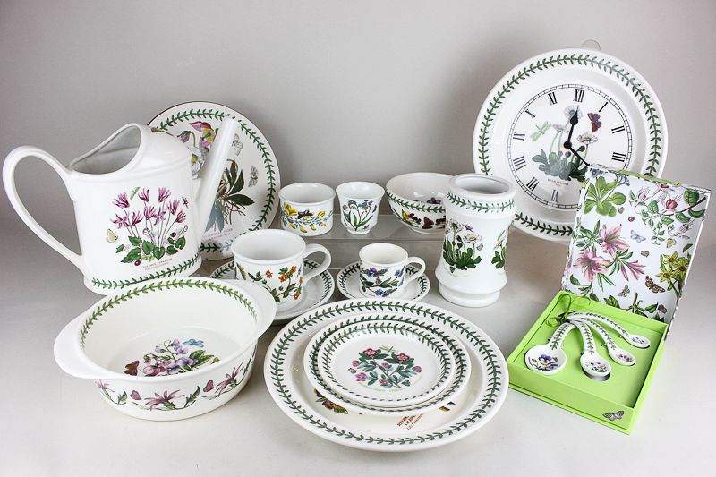 A collection of Portmerion Botanic Garden tableware including dinner plates, bowls, coffee cups, saucers, wall clock and watering can