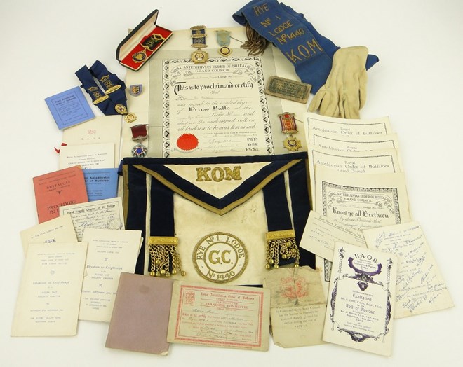 A Collection of Royal Antediluvian Order of Buffalos medals, apron and ephemera.