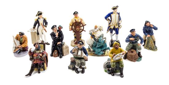 comprising The Boatman, Tall Story, The Foaming Quart, Sailor's Holiday, The Lobster Man, Shore Leave, The Helmsman, St. George, Sea Harvest and The Captain, together with a Royal Worcester porcelain figure titled Admiral C. 1780, each marked to the