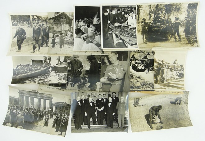 A Collection of Second World War press photographs, including military studies, with printed press notes verso (28).