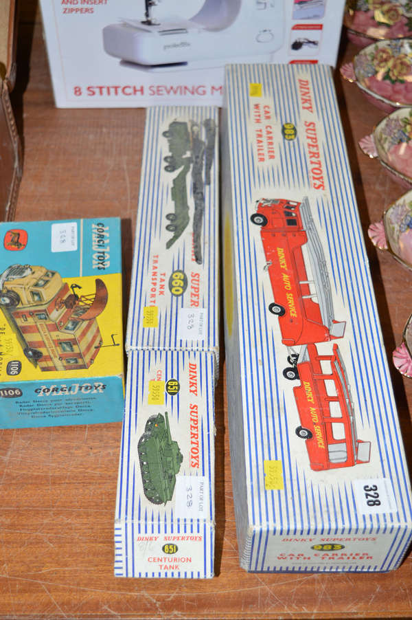 A collection of three boxed Dinky Supertoys and a Corgi major toy, comprising: Dinky Supertoys 983 R-carrier with trailer, in original box; Dinky Supertoys 660 tank transporter; Dinky Supertoys 651 centurion tank, in original boxes; and Corgi Toys ma
