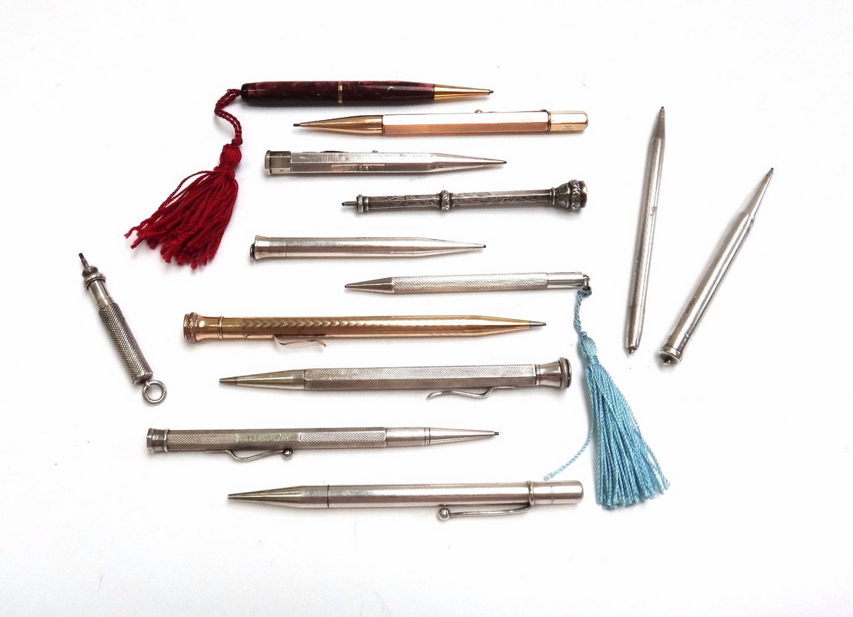 comprising; two rolled gold, a Yard O Led octagonal silver pencil (10cm), two similar larger silver hallmarked pencils, a Shaeffer sterling silver pencil, a sliding pencil by S. Mordan & Co., a Continental silver sliding pencil with amber glass termi