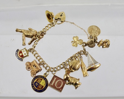 A COMBINED 9CT GOLD AND YELLOW METAL CHARM BRACELET