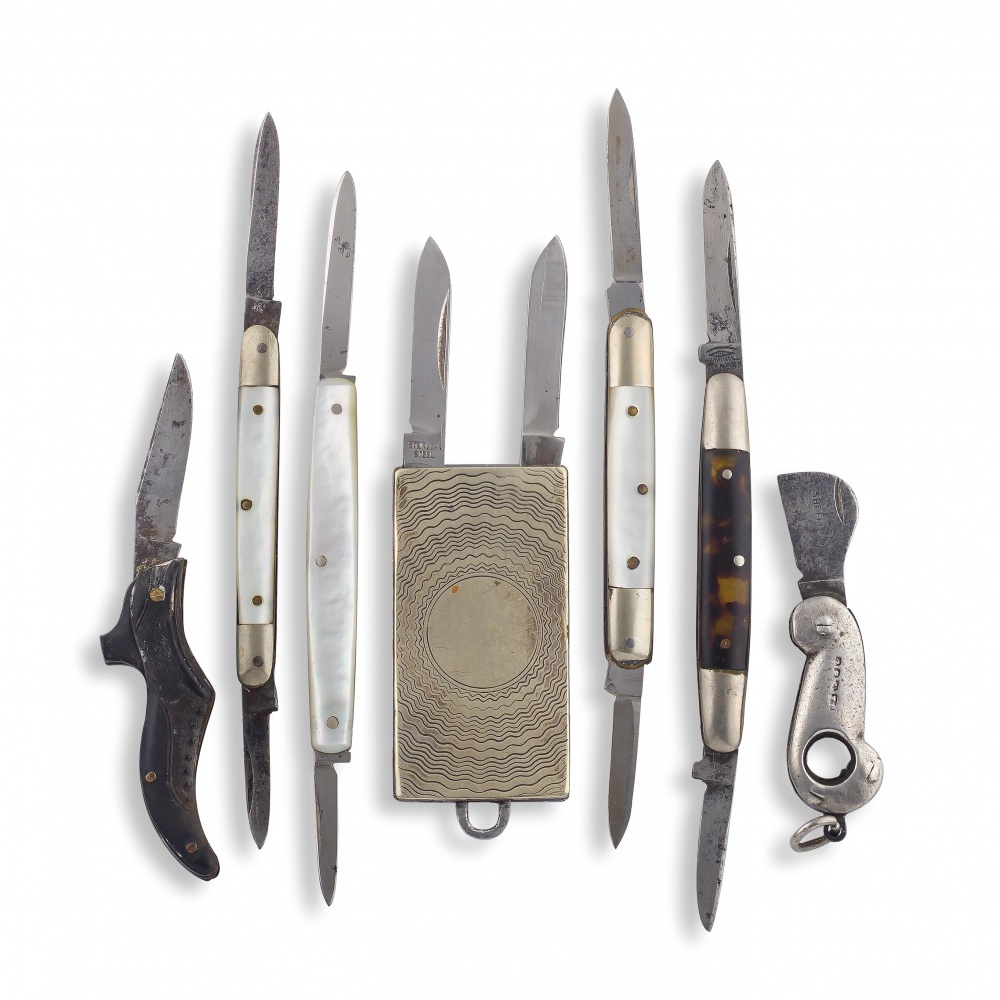 in the form of a shoe, 5cm long; three mother-of-pearl folding pen knives, 19th century, the longest 5,5cm long; a celluloid faux tortoiseshell folding pen knife, early 20th century, the blade marked witness, 6cm long; an engraved brass and chrome t