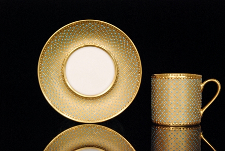 A contemporary coffee can and saucer decorated by former Royal Worcester gilder Ken Russell, the gilt ground with blue enamel jewelling, after the Dudley service, signed, can height 6.5cm